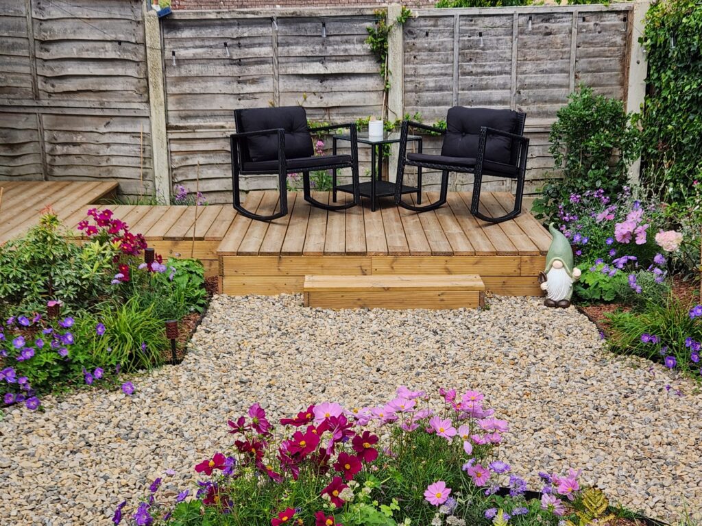 The crumbling concrete path has been covered with decking, treated with an anti-slip preservative. There is a decked plinth large enough for a small table & 2 chairs, a bench with a back or a small swing chair.